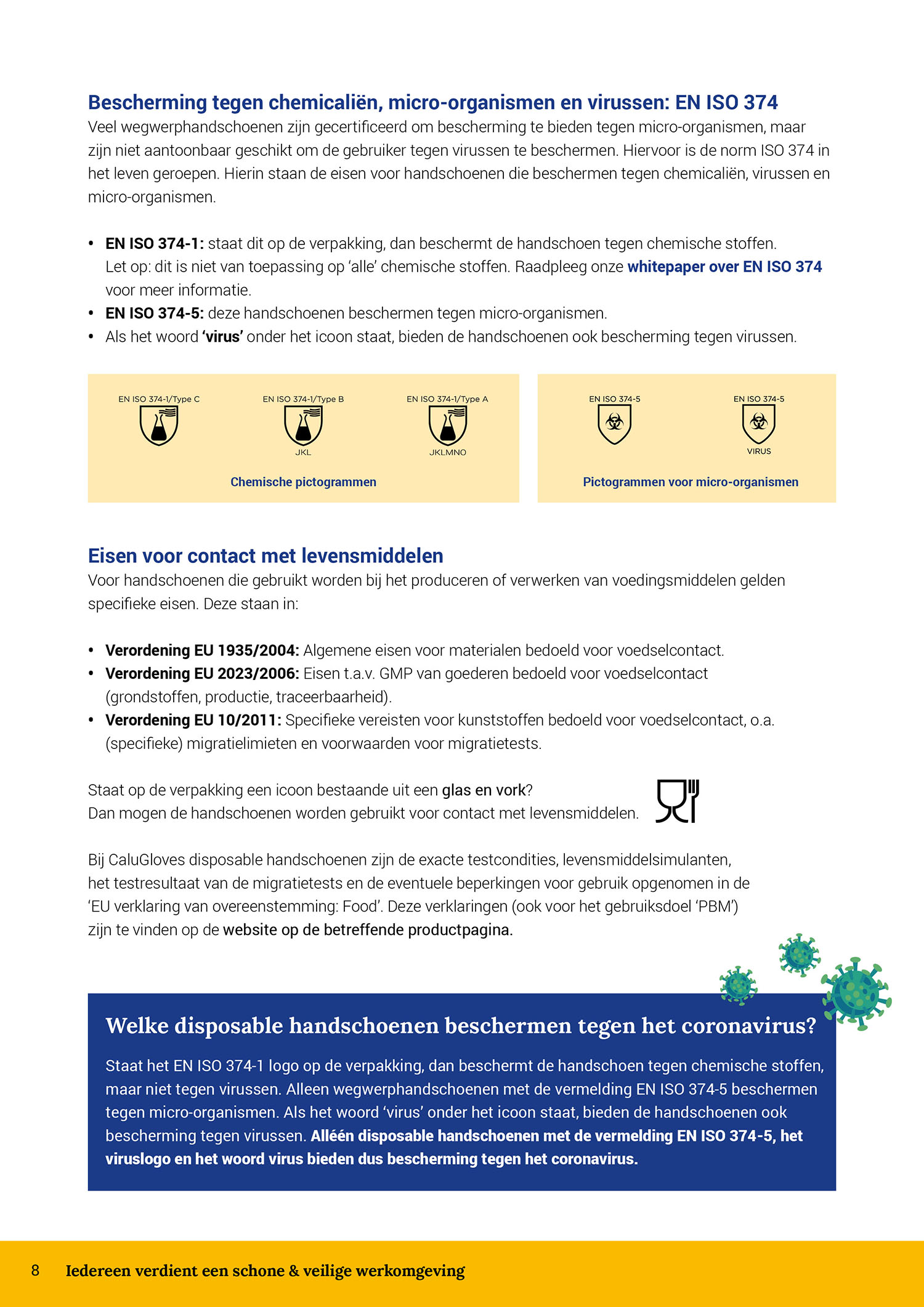 Veel wegwerphandschoenen zijn gecertificeerd om bescherming te bieden tegen micro-organismen, maar zijn niet aantoonbaar geschikt om de gebruiker tegen virussen te beschermen.