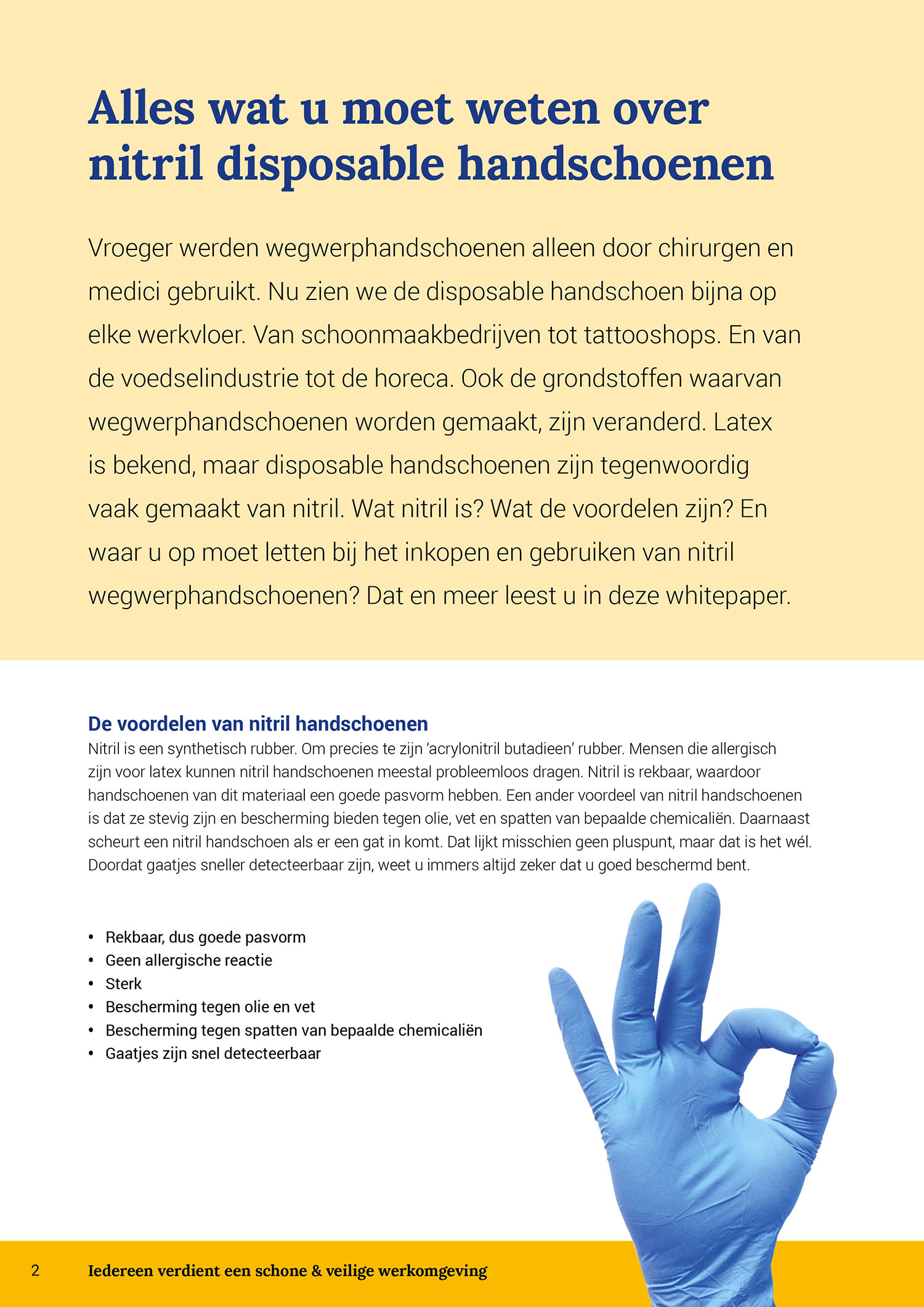 Disposable handschoenen zijn tegenwoordig vaak gemaakt van nitril. Wat is nitril? Wat zijn de voordelen? En waar moet u op letten bij het inkopen en gebruiken van nitril wegwerphandschoenen? Dat en meer leest u in dit handboek.